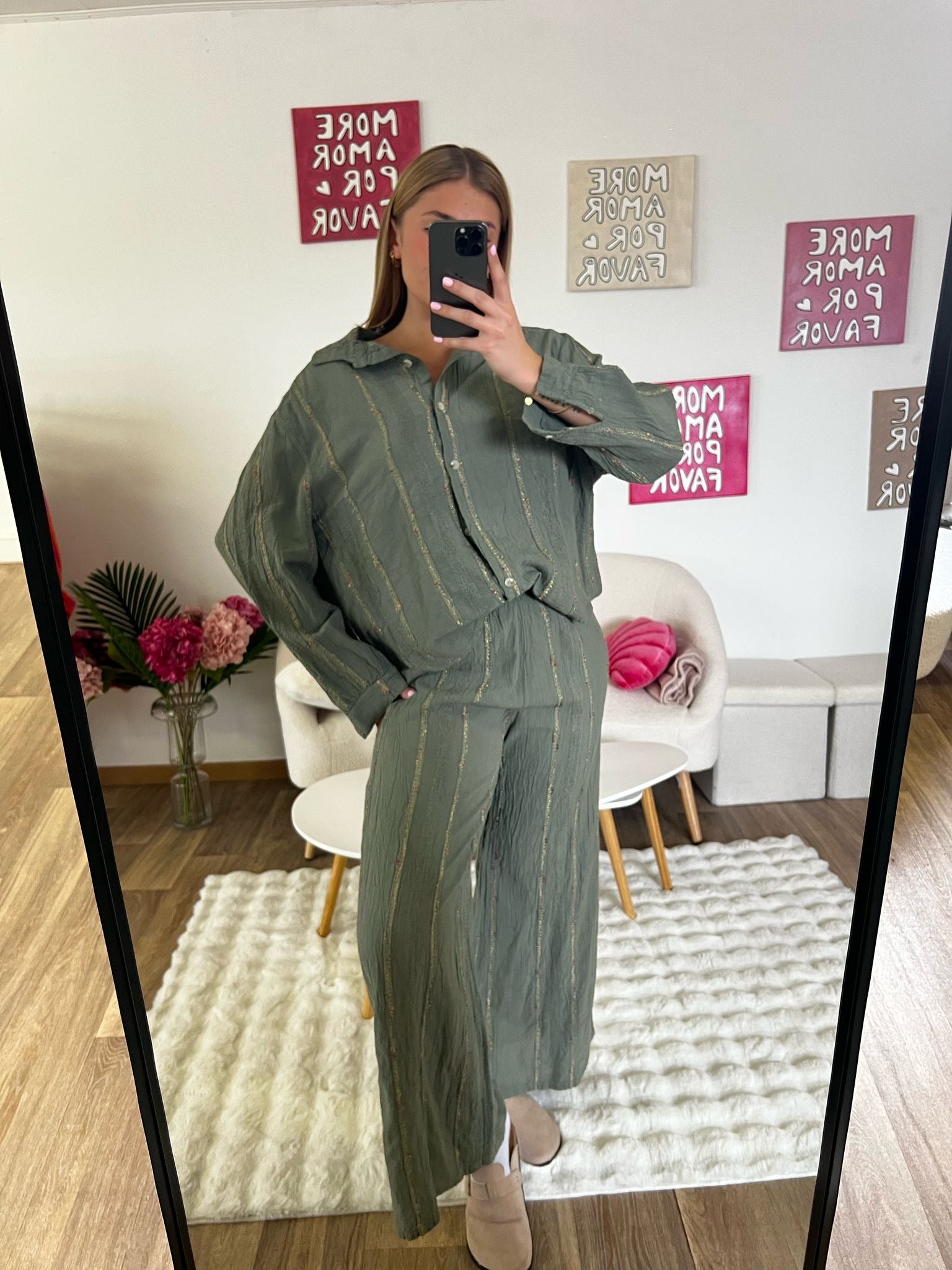 ♡ Ensemble gaze de coton kaki, avec pantalon et chemise